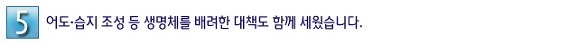 16°³ º¸¿Í ÇÏ±ÂµÏ ÁÖº¯ µî 23°÷¿¡´Â ¹°°í±â°¡ ÀÚÀ¯·Ó°Ô À̵¿ÇÒ ¼ö ÀÖ´Â ÀÚ¿¬Çü ¹°°í±â±æÀÎ ¾îµµ(åàÔ³)¸¦ ¸¸µé°í, ÇÏõ ÁÖº¯¿¡´Â ¼öÁú °³¼± ±â´ÉÀ» ÇÏ´Â »ýŽÀÁö¸¦ 39°÷¿¡ Á¶¼ºÇØ ¹°°í±âµéÀÇ ½°ÅÍ·Î Á¦°øÇÕ´Ï´Ù. ¶ÇÇÑ »ç¶óÁ®°¡´Â ÅäÁ¾¹°°í±â 12Á¾À» º¹¿ø ÁßÀ̸ç, ÀÌ¹Ì º¹¿øµÈ 5Á¾Àº ° »ó·ù¿¡ ¹æ·ùµÅ ´Ù¾çÇÑ ¾îÁ¾°ú °Ç°ÇÑ ¼ö»ýŰ踦 ´Ù½Ã ¸¸³¯ ¼ö ÀÖ½À´Ï´Ù. °ø»ç Áß¿¡´Â ¼ö»ýŰè¿Í ȯ°æ ÈѼÕÀ» ÃÖ¼ÒÈÇϱâ À§ÇØ ¿ÀʹæÁö¸· ¼³Ä¡, Áø°øÈíÀÔ½Ä Áؼ³, ±¸°£º° Â÷µî°ø»ç ½ÃÇà µî ģȯ°æ °ø¹ýÀ» Àû¿ëÇÕ´Ï´Ù.